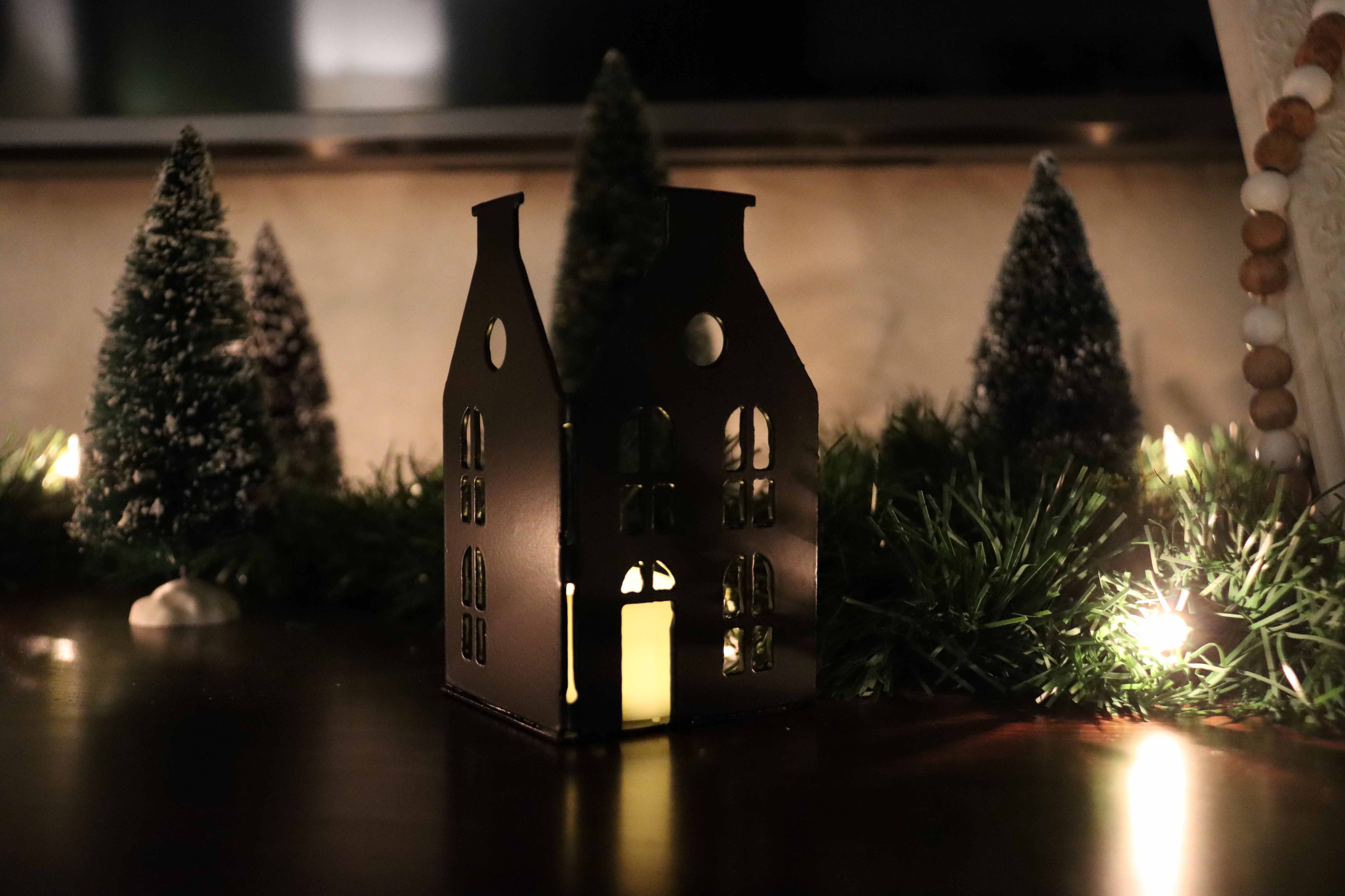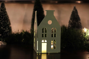 The simple roofline offers a slightly different architectural look while still pairing beautifully with our stepped Dutch front styles. Crafted from metal for durability and finished in a smooth powder coat, this piece is perfect for styling on mantels, shelves, windowsills, or tabletops. Place a standard tea light inside and enjoy the gentle light shining through the windows, bringing this charming little house to life.